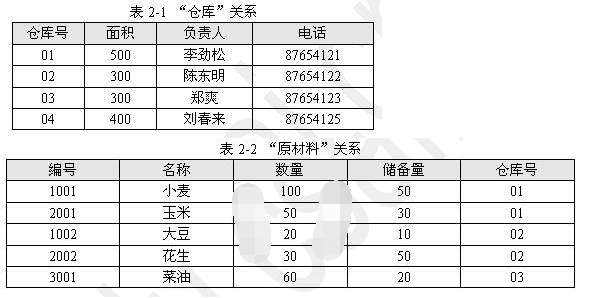 要求一种原材料只能存放在同一仓库中。“仓库”和“原材料”的关系实例分别如表2-1和表2-2所示。