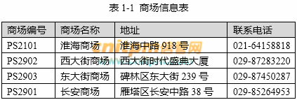 1. 商场需要记录的信息包括商场编号(商场编号不重复)、商场名称、地址和联系电话。某商场信息如表1-1所示。