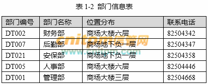 2. 每个商场包含不同的部门,部门需要记录的信息包括部门编号(不同商场的部门编号不同)、部门名称、位置分布和联系电话。某商场的部门信息如表1-2所示。