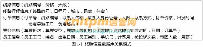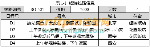 1.旅行社可发布旅游线路的信息,包含:线路的价格、天数、住宿情况,以及具体的行程安排等。不同的线路参观的景点及住宿情况不相同,如表1-1所示。