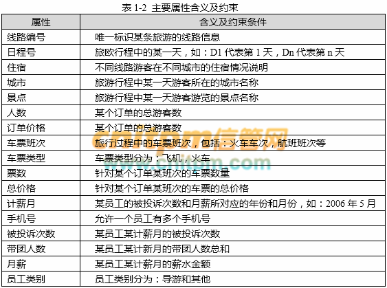 关系模式中主要属性的含义及约束如表1-2所示。