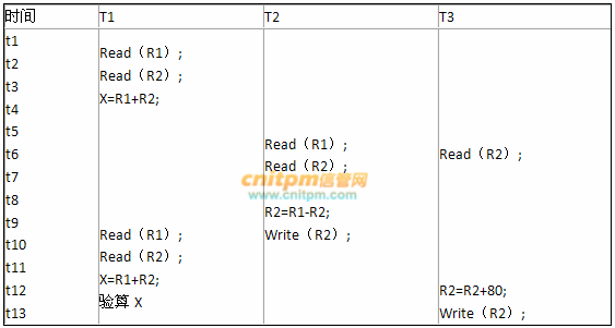 系统中有三个事务T1、T2、T3分别对数据R1和R2进行操作,其中R1和R2的初值R1=120、R2=50。假设事务T1、T2、T3操作的情况如下图所示,图中T1与T2间并发操作( ) 问题,T2与T3间并发操作( ) 问题。