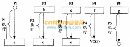 若用PV操作控制进程P1、P2、P3、P4和P5并发执行的过程,则需要设置5个信号量S1、S2、S3、S4和S5,且信号量S1~S5的初值都等于零。下图中a、b和c处应分别填写(1);d和e处应分别填写(2),f和g处应分别填写(3)。