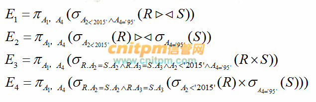 在关系R(A1,A2,A3)和S(A2,A3,A4)上进行关系运算的4个等价的表达式E1、E2、E3和E4如下所示:
