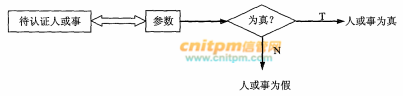 认证的基本思想是通过验证称谓者(人或事)的一个或多个参数的真实性和有效性,来达到验证称谓者是否名副其实的目的。这样,就要求验证的参数和被认证的对象之间存在严格的对应关系,理想情况下这种对应关系应是唯一的。其基本原理如下图所示。