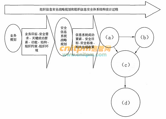 EA 是一种基于组织业务目标,对信息系统进行构建和改进的方法和管理工具。因此,组织在设计或对现有系统进行升级更新时,都可以利用 EA 对己有的信息系统进行分析。EA 包含四层架构,包括业务体系结构、信息体系结构、解决方案体系结构、信息技术体系结构,这四层体系结构也可视为对组织信息化的四种视角。EA 应用到组织的信息安全战略规划和信息安全体系结构的设计过程中如下图所示,根据EA的四层架构将下图中的a、b、c、d补充完整。