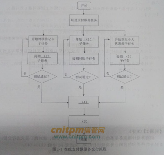 为了提高系统开发效率,公司的系统分析师王工设计了一个基于微服务的软件交付流程,其核心思想是将业务功能定义为任务,将完成某个业务功能时涉及到的步骤和过程定义为子任务,只有当所有的子任务都测试通过后改业务功能才能上线交付。请基于王工设计的在线支付微服务交付流程,从(a)~(f)中分别选出合适的内容填入图1-1中的(1)~(5)处。
