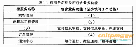 识别并设计微服务是系统开发过程中的一个重要步骤,请对题干需求进行分析,对微服务的种类和包含的业务功能进行归类,完成表 1-1 中的(1)~(4)。