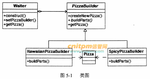 【说明】某快餐厅主要制作并出售儿童套餐,一般包括主餐(各类比萨)、饮料和玩具,其餐品种类可能不同,但其制作过程相同。前台服务员(Waiter)调度厨师制作套餐。现采用生成器(Builder)模式实现制作过程,得到如图6-1所示的类图。