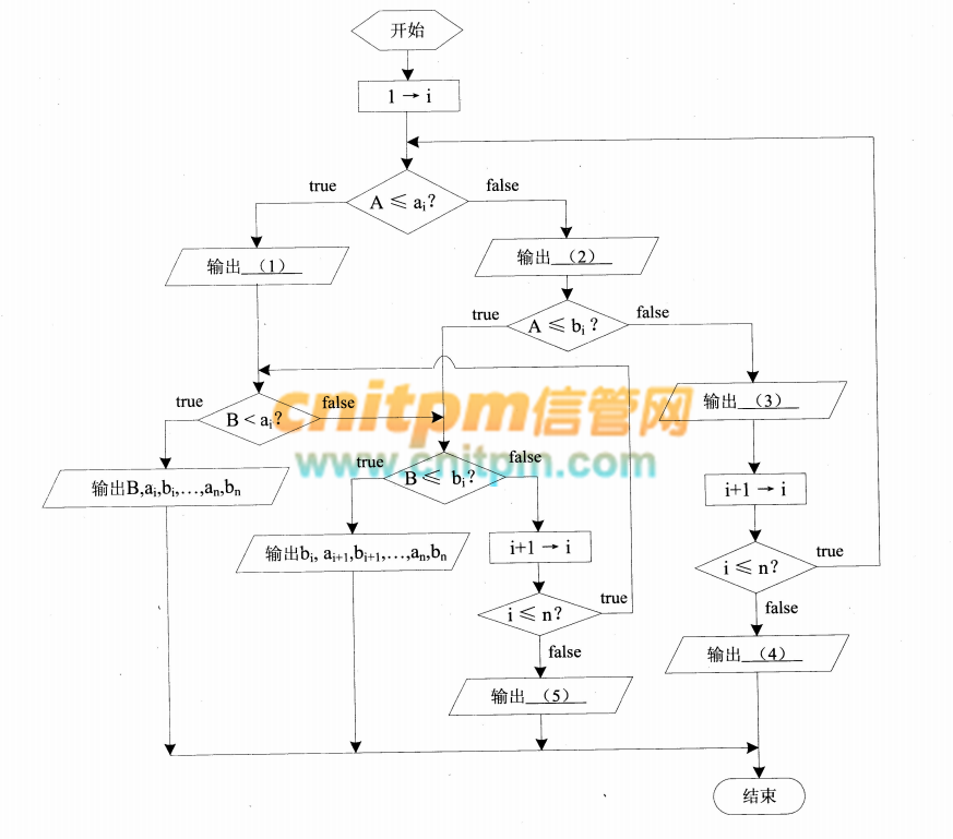 该流程图采用的算法是:先在a1,b1,a2,b2,...,an,bn中扫描定位A点,再继续描定位B点,在扫描过程中随时输出已确定的区间的端点值。问题:1.1 阅读以下说明和C代码,填写程序中的空(1) ~(5),将解答写入答题纸的对应栏内。