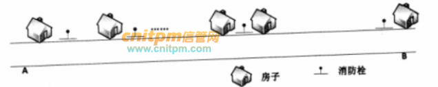 在一条笔直公路的一边有许多房子,现要安装消防栓,每个消防栓的覆盖范围远大于房子的面积,如下图所示。现求解能覆盖所有房子的最少消防栓数和安装方案(问题求解过程中,可将房子和消防栓均视为直线上的点)。