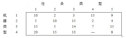 考虑四种不同类型的机器和五项任务的分配问题,可利用的四种类型机器的台数是25,30,20和30,五项任务的工作量是20,20,30,10和25,不能把第4类机器分配到第4项工作上,单位成本如下表所示,求各类机器分到各项任务上的最优分配成本是()。 A、560 B、550 C、570 D、580