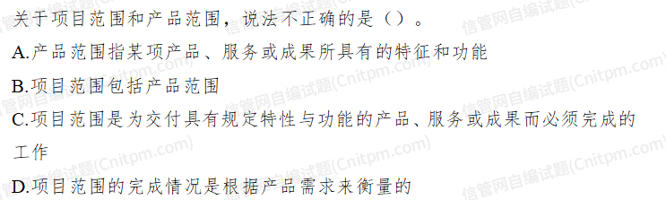 关于项目范围和产品范围,说法不正确的是()。A.产品范围指某项产品、服务或成果所具有的特征和功能B. - JRS直播