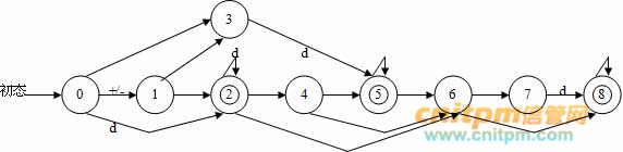 下图为一个确定的有限自动机 DFA 的状态转换图,有向弧上可以标记下列符号之一:小数点‘.’、十进制数字‘d’、正负号‘+/-’及科学记数标志‘e’。请补充图中弧上的标记,使该 DFA 可以识别十进制形式和科学记数表示形式的实数。