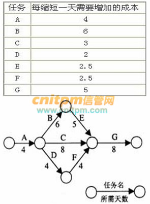 某工程计划如下图所示,由于任务A延误了一天,为保证该工程按时完成,应将任务( )缩短一天,使成本增加最少。下表列出了各任务每缩短一天所需增加的成本。