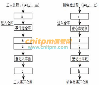某工厂仓库有一名保管员,该仓库可存放n箱零件。该工厂生产车间有m名工人,只要仓库空闲,工人将生产好的整箱零件放入仓库,并由保管员登记入库数量;该工厂销售部有k名销售员,只要仓库库存数能满足客户要求,便可提货,并由保管员登记出库数量。规定工人和销售员不能同时进入仓库,但是工人和工人,销售员和销售员可以同时进入仓库,其工作流程如下图所示。