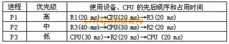 在一个单 CPU 的计算机系统中,有三台不同的外部设备 R1、R2、R3 和三个进程P1、P2、P3。系统 CPU 调度采用可剥夺式优先级的进程调度方案,三个进程的优先级、 使用设备的先后顺序和占用设备时间如下表所示: