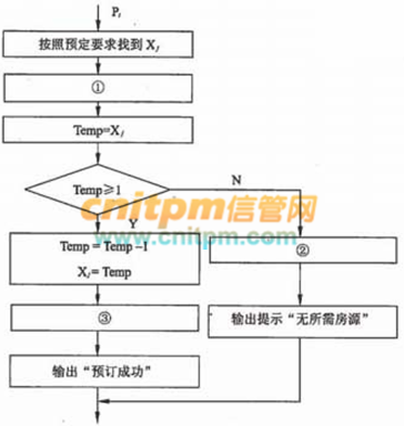 某酒店的客房预订系统有 n个预订终端,系统为每个终端创建一个进程Pi(i=1,2,…,n)。假设Xj(j=1,2,…,m)存放各种规格住房的剩余房源,Temp为临时工作单元,终端创建一个进程Pi的工作流程如下图所示,图中①、②和③处将执行P操作或V操作。为了保证各进程间的同步与互斥,系统初始化时将信号量S赋值为 (1) ,下图中①、②和③处应依次填入 (2) 。