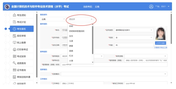 1、报考人员登录云南省计算机技术与软件专业技术资格考试网站http://www.ynxr.com,点击“考试报名”快速入口,选择“云南”按提示进行注册登录,进行网上报名。